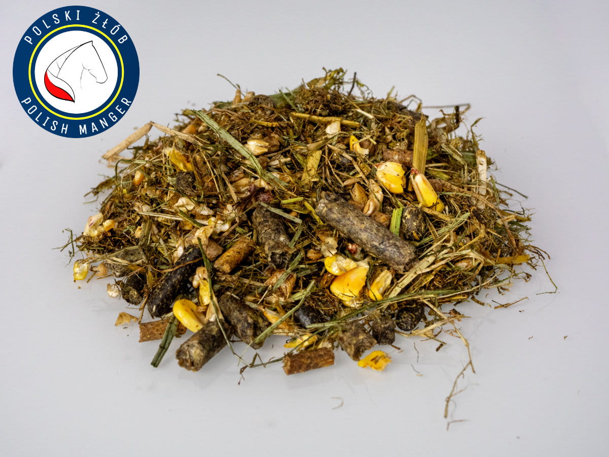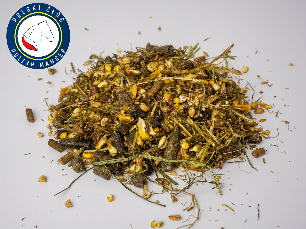 Skład i udział procentowy: Jęczmień mikronizowany gnieciony , siano cięte sieczka , kukurydza mikronizowana gnieciona , otręba pszenna , trawokulka granulat wysłodka buraczana granulat i instant , melasa płynna , jabłko suszone , słód sodowy łuska , olej sojowy, : wytłok porzeczki suszony, chleb świętojański mielony, malina płatkowana, siemię lniane, cykoria, jeżówka purpurowa, mięta, dodatki: E672 Witamina A, E671 Witamina D3, E3a700 Witamina E