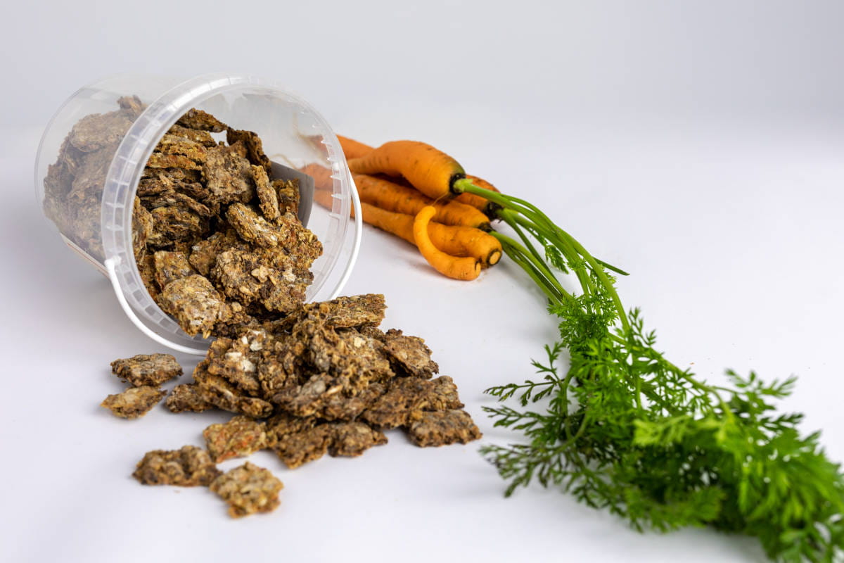 Smakołyk marchewkowy dla koni w postaci aromatycznych ciasteczek.
