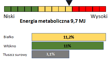 Białko ogólne 11,2%, Włókno surowe 11%, Popiół surowy 3,9%, Tłuszcz surowy 3,1%, Skrobia 29,6%, Wapń 1%, Fosfor 0,5%, Sód 0,4%, WitaminaA 15180j.m, WitaminaD3 3036j.m, WitaminaE 45,5j.m