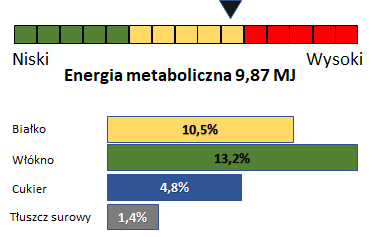 Białko ogólne 10,5%, Włókno surowe 13,2%, Popiół surowy 4,6%, Tłuszcz surowy 1,4%, Skrobia 24,8%, Cukry łącznie 4,8%, Wapń 1,1%, Fosfor 0,5%, Sód 0,5%, WitaminaA15000j.m, WitaminaD3 3000j.m, WitaminaE 45j.m